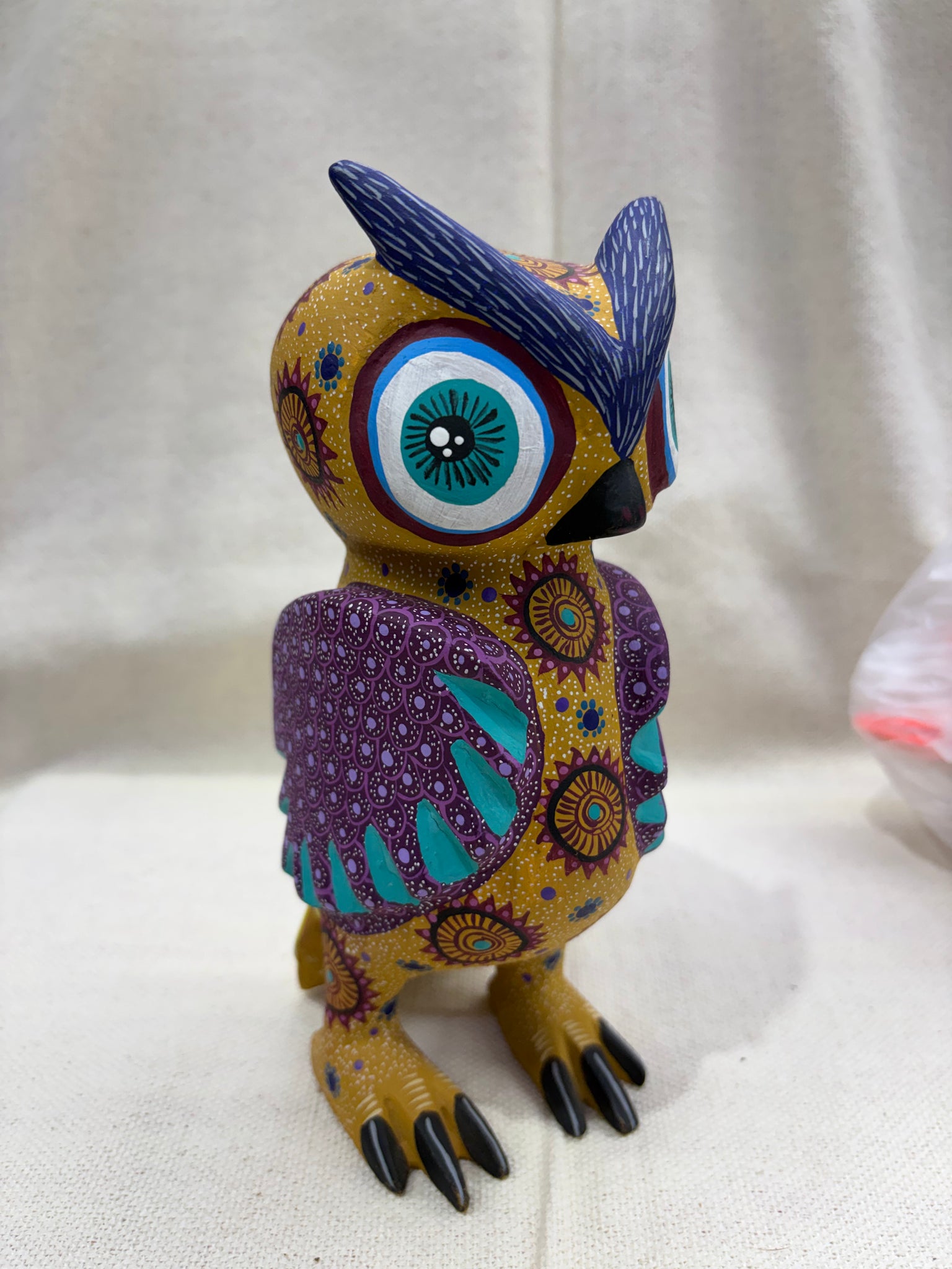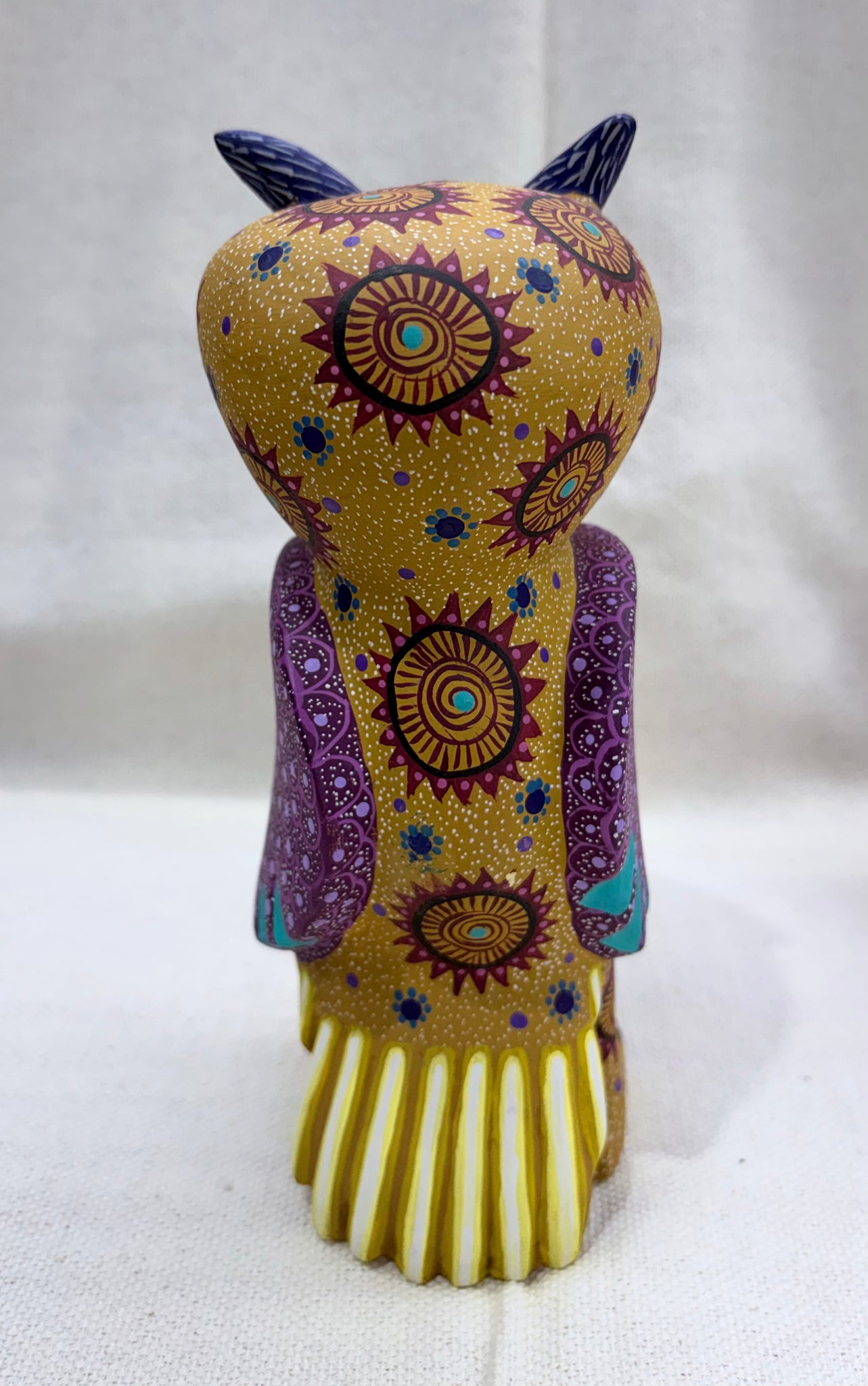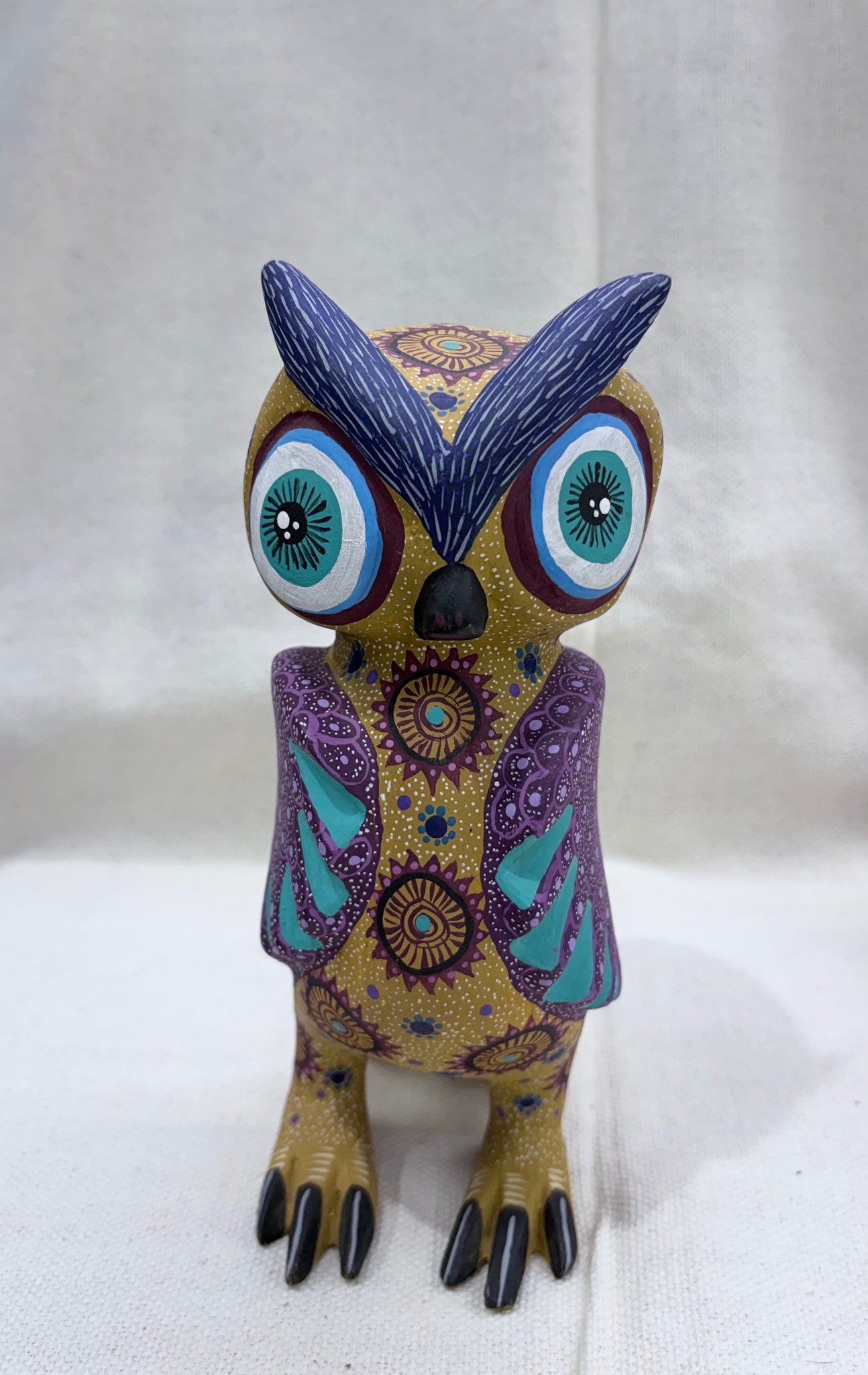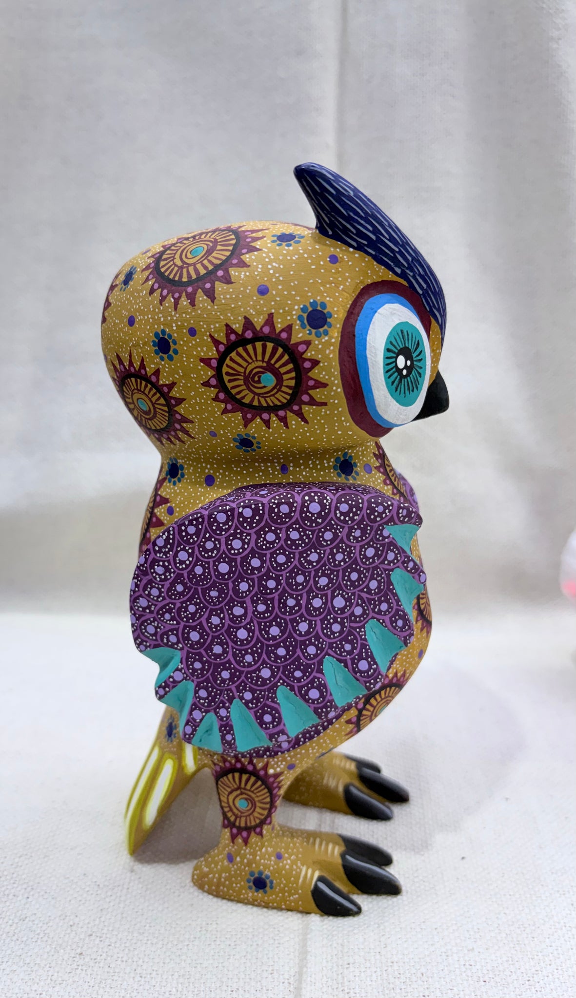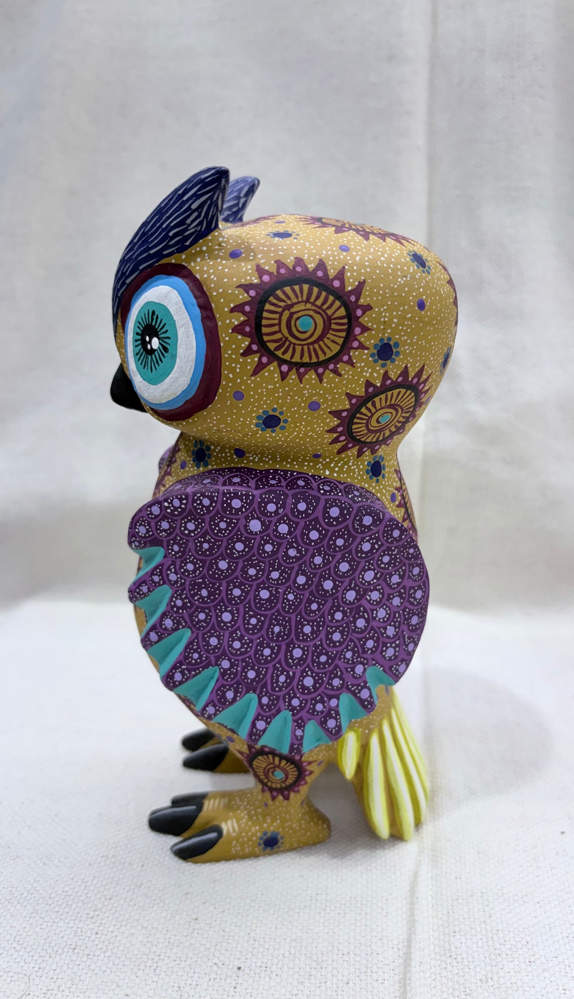 Figura artesanal tallada a mano en madera de copal por artesanos mexicanos 🇲🇽. Presenta un decorado detallado en tonos beige y azul 🎨, resaltando su textura y estilo único.